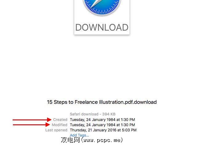 您是否注意到Mac上不完整下载的 Created 和 Modified 时间戳?前进。立即查看。他们将阅读1984年1月24日-史蒂夫·乔布斯(Steve Jobs)推出苹果有史以来第一台Macintosh计算机的那一天。