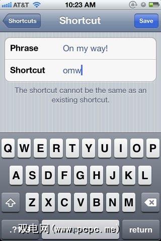 如果您不使用键盘快捷键在您的设备上,您错过了一项省时的功能。打开设置>常规,然后向下滚动到键盘>快捷方式。点击右上角的+按钮,添加短语,名称或常用词,然后为其分配快捷方式。请确保使用不构成真实单词前几个字母的字母组合。