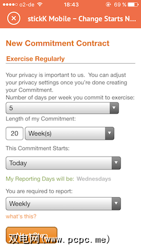 Stickk在要求您签署“承诺合同"的情况下更加正式。在指定您想踢的习惯或想要达到的目标后,它会询问您是否要为成功打赌。是的,那是真钱,而不是专卖钱。