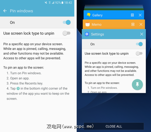 固定会阻止来自所有其他应用程序的通知,阻止您访问通知栏,并阻止您切换应用程序。您真的陷入了一个单一的应用程序中。您可以同时按住 Recents 和 Back 键退出。要真正确保它保持锁定状态,您可以要求输入PIN码,图案或密码才能退出固定的应用。
