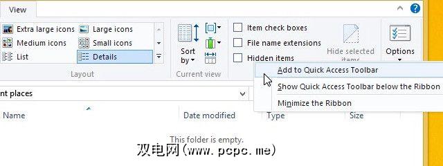 有一种更快的方法来访问您喜欢的项目,例如属性对话框或新文件夹操作。只需右键单击功能区中的每个此类项目,然后选择添加到快速访问工具栏。通过将它们放置在顶部右边的谨慎工具栏中,您可以一键访问这些项目。