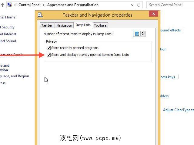Windows 8::通过任务栏上下文菜单调出任务栏和导航属性对话框。切换到跳转列表标签,然后取消选中在跳转列表中存储并显示最近打开的项目旁边的框,然后点击应用。请记住,该操作还将隐藏右键单击任务栏图标时出现的跳转列表。
