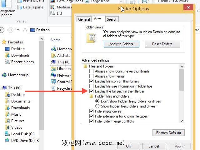 在标题栏中具有完整路径非常方便,但默认情况下在Windows 8及更高版本中不再显示该路径。您可以很轻松地将其带回!单击资源管理器功能区中的查看>选项,打开文件夹选项对话框。切换到对话框中的查看标签,在标题栏中找到显示完整路径选项,然后选中其旁边的框。