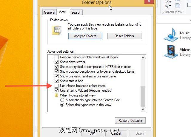 要在Windows 7中启用复选框功能,请转到组织>文件夹选项,并在视图下标签>高级设置,选中使用复选框选择项旁边的复选框。