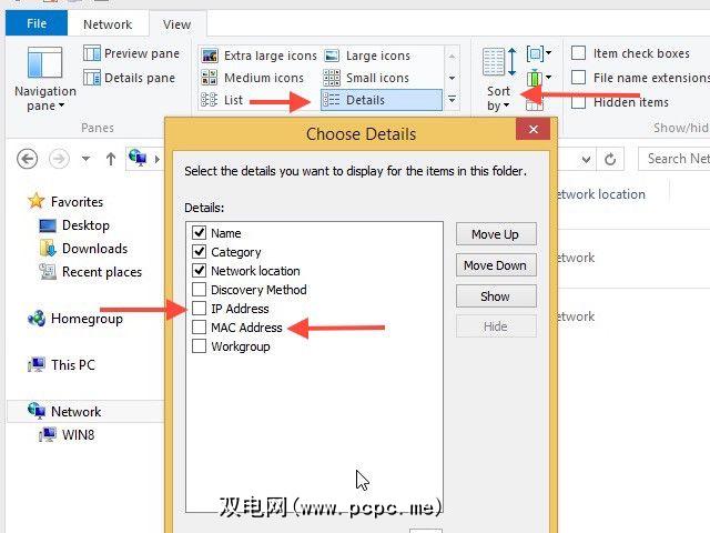 打开资源管理器,然后点击网络在侧边栏中。在功能区的视图标签下,单击详细信息以切换到“详细信息"视图。接下来,点击排序方式,然后从下拉菜单中选择选择列。