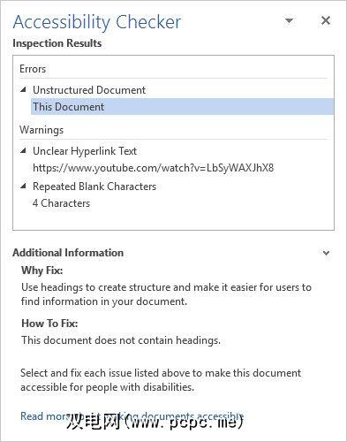 “可访问性检查器"任务窗格显示有关如何解决文档中任何问题的潜在问题和解决方案。