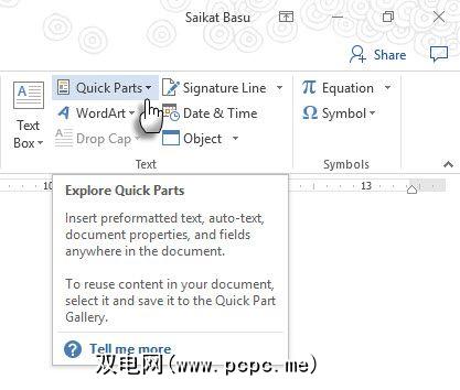 快速零件是Word和Outlook中可用的“构建块"。将它们视为尚未成熟的模板。顾名思义,它们是您要在Microsoft Word中使用的任何内容的可重用部分。它们可以是文本,文本框,表格,列表,封面,水印,书目或任何其他形式的内容的单个或多个段落。这些可重复使用的模板像任何可重复使用的模板一样,可以节省大量的时间,尤其是在格式和内容重复的区域。