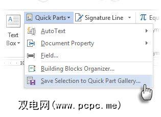 要重用此内容,请将光标置于文档中的正确位置,单击插入>快速零件,然后然后选择已保存的选择。