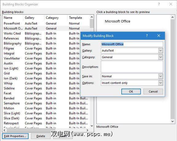 使用 Building Blocks Organizer (构建模块管理器)列出Word中所有可用的构建模块。您始终可以编辑它们的属性,删除和插入新的Building Block。
