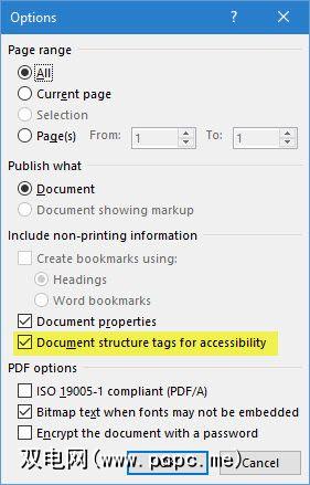 Microsoft Office在将文档转换为PDF时会自动对其进行标记,但是您应该请注意控制它的设置。