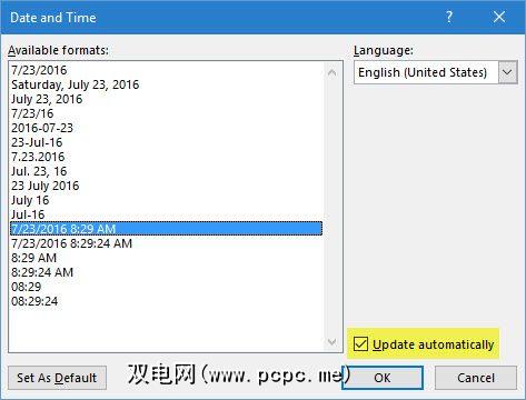 在对话框中,选择要使用的日期格式。启用自动更新复选框,以确保每次打开文档时该日期都保持最新。