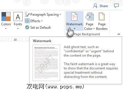 转到丝带>设计>水印。使用这四个默认水印中的任何一个或创建自己的默认水印。