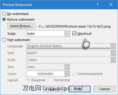 点击自定义水印>图片水印并浏览到图像。除非您取消选中清洗框,否则它会自动变亮,以免干扰文档文本。
