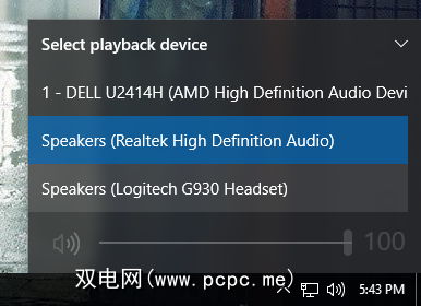 您不再需要在“控制面板"中摸索更改音频的播放设备。现在,您可以直接从任务栏切换它。为此,请在通知区域中单击扬声器图标,然后会出现音量滑块。在此处,单击音频设备名称,它将弹出一个列表,您可以更改为该列表。只需点击所需的播放设备即可完成。您甚至可以独立控制音量滑块。