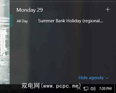 任务栏中的时钟和日历集成得到了改善。如果您在通知区域中单击时间,那么您将看到当前时间,日期和日历-所有标准内容。新的集成是议程区域,其中显示了您当天的活动。这与Windows 10随附的日历应用程序链接,请不要忘记您可以将Outlook,Google和iCloud日历与此绑定在一起。