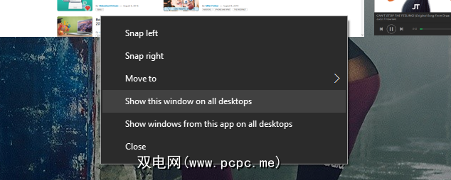 使用虚拟桌面功能时,您现在可以使一个窗口出现在所有桌面上。为此,请按 Windows键+ Tab 打开“任务视图"。然后右键单击一个窗口,然后选择在所有桌面上显示此窗口。您还可以选择在所有台式机上显示此应用程序中的窗口,它将从一个应用程序中复制多个窗口,而不仅仅是活动的应用程序。