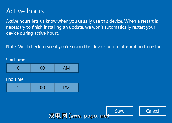 Windows Update变得更加受人尊敬,尽管它仍然会强制您进行更新。现在,您可以指定一个时间段(最多12个小时),通常在该时间段内使用系统。在这些时间内,Windows Update不会自动重新启动计算机以完成安装。