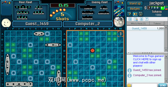Pogo有175多种免费在线游戏。您使用搜索或单击可能会在右侧找到的战舰图片。您可以注册并玩,也可以以客人的身份玩。注册可以将您连接到Pogo游戏社区中的其他玩家。该游戏还启用了聊天功能。