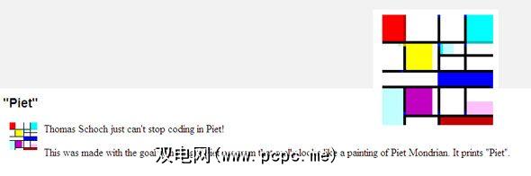 Piet是另一种深奥的编程语言,其代码类似于抽象绘画。它使用20种不同的颜色,这些颜色按块排列。每种颜色对应一种特定的行为。命令是通过解释程序在程序中传播时从一个颜色块到下一个颜色块的过渡来定义的。