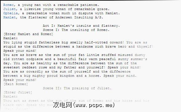 SPL(莎士比亚编程语言)是一种具有“美丽"源代码的语言,类似于莎士比亚的戏剧。主要目的是使程序看起来不是程序。正如莎士比亚戏剧中所期望的那样,该语言具有标题,角色,动作和场景,进入和退出指令,行。例如,字符是变量。它从戏剧的定义结构形式中汲取了灵感。与其他深奥的编程语言相比,SPL易于理解,因为该程序本身是用普通的英语和戏剧形式编写的。
