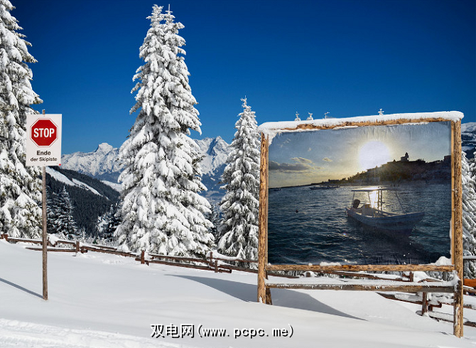 在下面的示例中,您可以看到我放置了我的一个阳光明媚的假期之一是在滑雪坡广告牌上。有趣的并置,我相信您会同意。