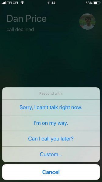 要发送消息,请在同时按下消息按钮电话响了。共有三个预先写好的选项:抱歉,我现在不能讲话,我在路上,以及我可以稍后再打给您吗?。您还可以通过点击相应的选项来输入自定义消息。