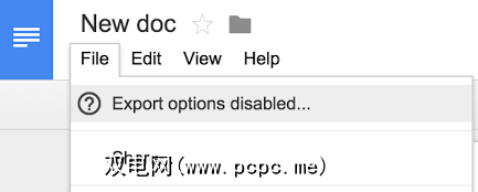查看者将在特定文档,电子表格和演示文稿的“文件"和“编辑"菜单的顶部看到“导出选项已禁用"通知。