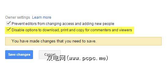 选择禁止为评论者和查看者下载,打印和复制选项。点击保存更改。