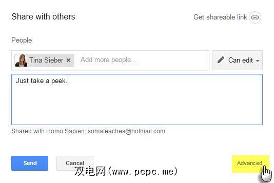 在与其他人共享对话框中,添加协作者的名称,然后请点击右下角的高级选项。