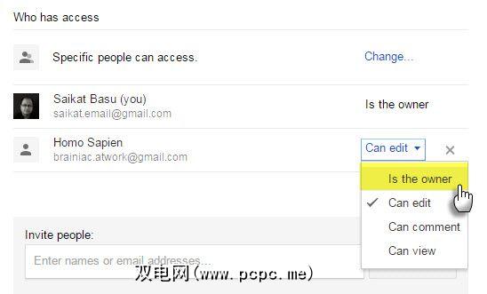 单击共享框右下角的高级。单击您要拥有文件或文件夹的人员名称旁边的下拉菜单。选择是所有者。单击完成。