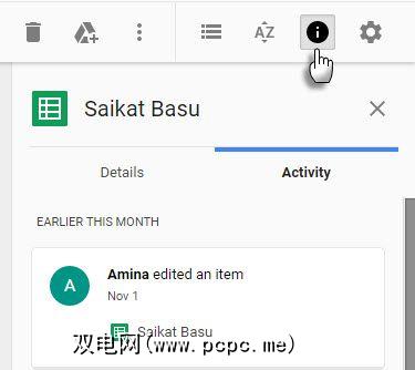 转到查看详细信息(单击工具栏上的“ I"图标)。浏览活动标签,以快速查看您最近共享的文件。