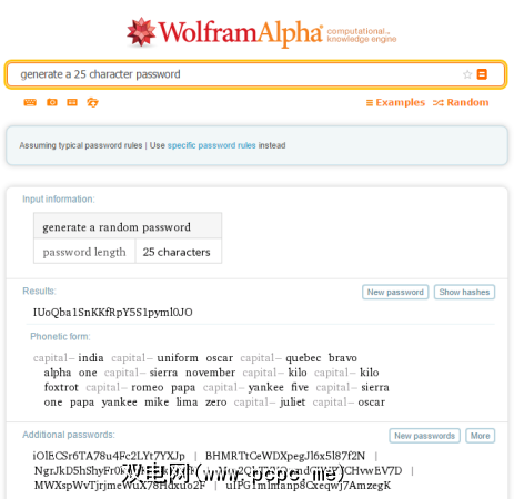 Wolfram Alpha还会即时生成密码。只需说出您想要的内容即可。因此,“生成25个字符的密码"(例如)。如果您不喜欢第一个密码,那么您将获得密码,甚至还有6个密码。