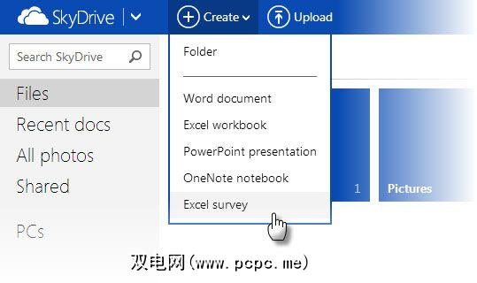 2。点击创建按钮,然后选择 Excel调查。