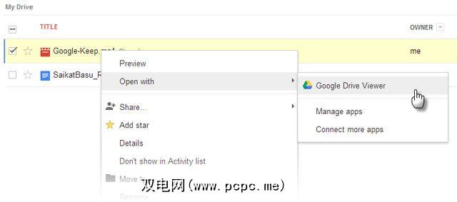 3。右键单击上传的视频文件,然后选择“使用– Google Drive Viewer打开" 。