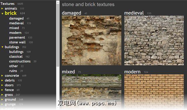 正是624块石头和砖块的纹理吸引了我此站点。我加入了“损坏",“中世纪",“混合",“人行道",“墙壁"和“现代"等子组。高分辨率纹理的集合很多,从上面的屏幕快照中可以看到,每种主要类型都分为较小的子组。