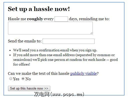 每个人都需要不时提醒您。使用HassleMe,您可以确定需要提醒您有关目标的频率,然后站点将麻烦提醒发送到您的电子邮件收件箱。您只需设置要困扰的天数间隔,然后键入要困扰的确切消息。
