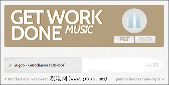 完成工作音乐。没什么真正了解的,几乎没有任何控件。有四个按钮:播放/暂停,快速和更快按钮,还有一个名为“ 给下一首歌加长"的“下一首"按钮