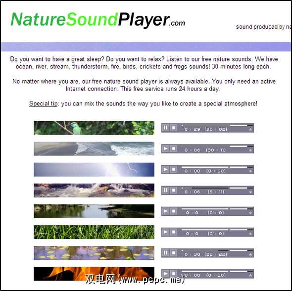 NatureSoundPlayer.com 具有简单的界面并具有8种来自大自然的声音。虽然没有这些声音的标题。而是有描述每个声音的图像。例如,“海浪"具有海浪和海滩的图片; “篝火晚会"上有火焰的图片,依此类推。