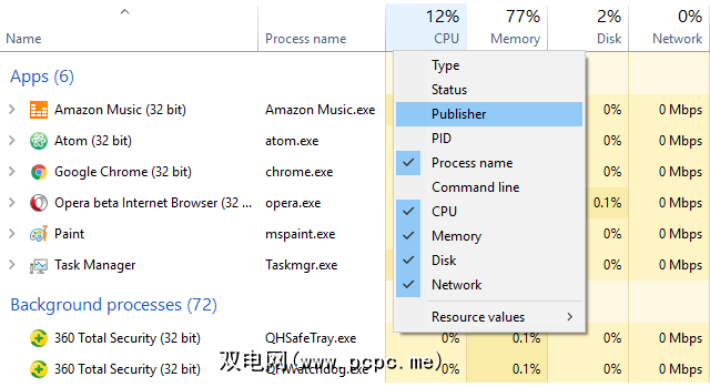 默认情况下,新的任务管理器在列出进程时仅显示五列:名称,CPU,内存,磁盘和网络。尽管这些是最重要的详细信息,但实际上您只需右键单击标题区域即可添加多达六列。