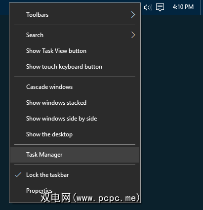 3。任务栏。如果您右键点击屏幕底部的任务栏,可能会一次又一次错过一个选项:任务管理器!如果您的手不在键盘上,这是最简单的方法。
