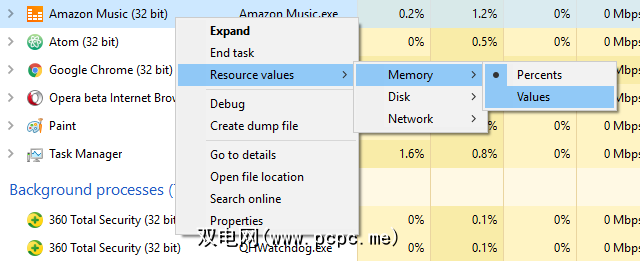 要切换这些RAM,只需右键单击任何过程中,导航到资源值子菜单,选择要更改的资源类型,然后选择值或百分比。