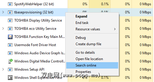 Windows可以提供帮助。只需右键单击任何过程,然后选择在线搜索操作即可。这将在浏览器中启动一个带有应用程序名称和进程名称的搜索,这将帮助您确定它是安全还是恶意的。