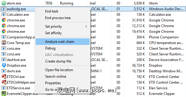 这就是任务管理器中的分析等待链功能派上用场的原因。它可以告诉您某个进程何时等待另一个进程,这可以帮助您确定应用程序没有响应的原因(即哪个进程是真正的罪魁祸首)。仅在“详细信息"选项卡下可用。