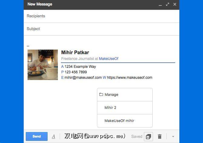 安装扩展程序,添加您的详细信息(例如照片,网站,社交资料,个人信息)并创建签名。现在,您可以在几秒钟内发送的任何电子邮件中附加此签名。实际上,它比WiseStamp容易,并且不会在签名中添加任何“由Blade制造的"附件。