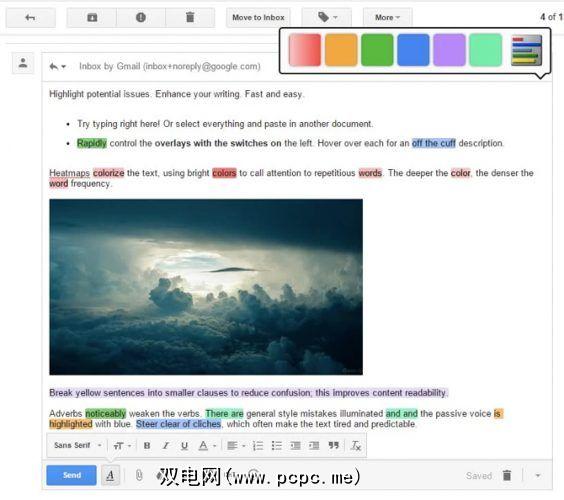 该扩展程序使用不同的颜色突出显示重复的单词,被动语态,副词和陈词滥调。它甚至会为您提供有关电子邮件的可读性和样式的建议。