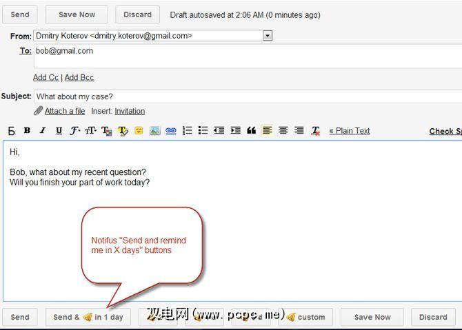 Notifus使事情简单,更重要的是,使事情免费。点击按钮之一以发送并在X天内提醒我,而不是“发送"按钮。如此简单,并且可以正常工作。