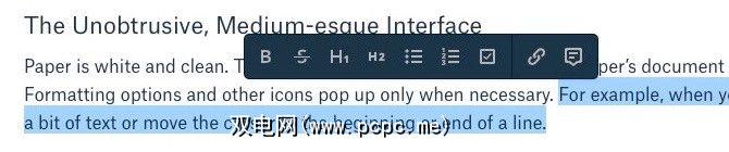 纸张超级白,超级干净。这是您注意到的第一件事。屏幕上唯一的主要元素是顶部的工具栏。格式化选项和其他按钮仅在必要时弹出。例如,当您突出显示一些文本或将光标移动到行的开头或结尾时。