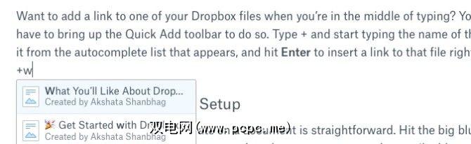 想要在您进入时将链接添加到其中一个Dropbox文件中打字中间?您无需调出“快速添加"工具栏即可。输入“ +"并开始输入文件名。然后,您可以从出现的自动完成列表中选择它。点击 Enter ,在该位置插入指向该文件的链接。