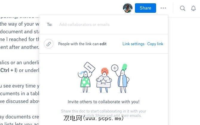 要邀请团队成员协作处理文档,请点击工具栏中蓝色的大 Share 按钮。这会给您一个弹出框,您可以从中使用他们的电子邮件地址邀请其他人。在此框中查找微小的链接设置链接。它使您可以调整文档权限,即谁可以访问文档以及他们是否可以编辑文档或仅对其进行注释。