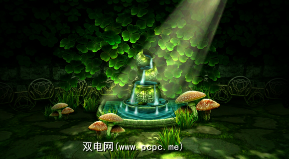 这个迷人的凯尔特人小花园景象是一个喷泉,坐在一束光中,周围是蘑菇,后面是三叶草墙。
